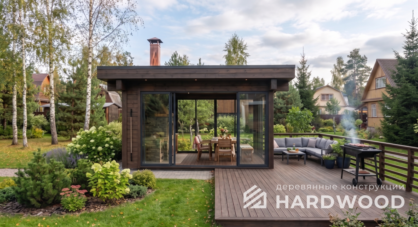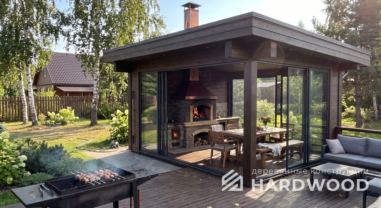 Закрытую или тёплую беседку с панорамным остеклением, продуманной вентиляцией и стабильной тягой. Добавьте тёплые полы/ИК-обогрев и получите «летнюю кухню», которой удобно пользоваться и в межсезонье.